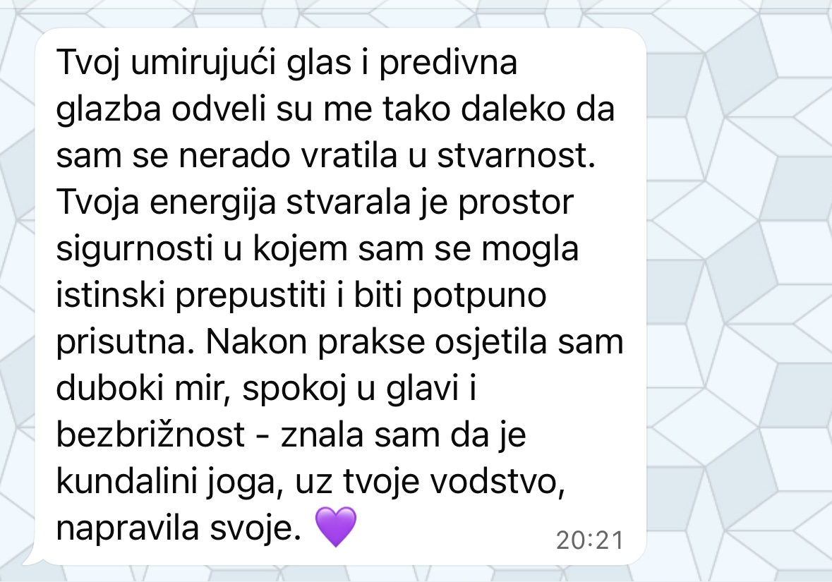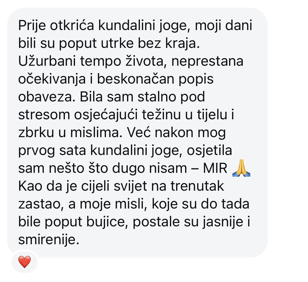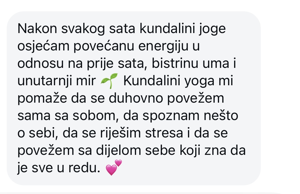 Ne. Cilj Kundalini joge je smanjenje stresa kroz regulaciju živčanog sustava, a ne zadiranje u vjeru. Ne traži da vjeruješ u nešto novo, nego upravo suprotno – pomaže ti da se još snažnije povežeš s onim u što već vjeruješ.
